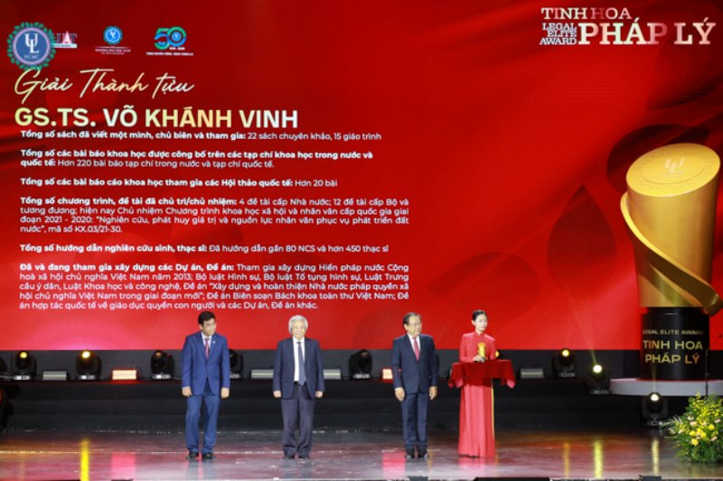 GS.TS Võ Khánh Vinh là một trong những nhà khoa học có nhiều thành tựu nổi bật trong nghiên cứu pháp luật với hệ thống công trình học thuật có giá trị lý luận và thực tiễn cao, đồng thời đóng góp vào việc phát triển các hướng nghiên cứu đa ngành, liên ngành, góp phần hiện đại hóa khoa học pháp lý Việt Nam.
