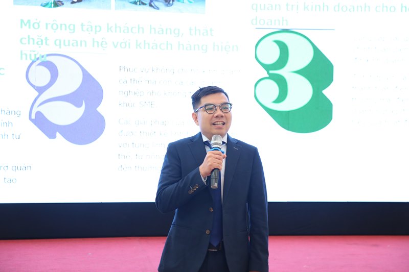 Tiếp nối các giải pháp số của MISA, ông Ngô Bình Nguyên, Giám đốc Phân khúc Hộ kinh doanh VPBank đã giới thiệu về các giải pháp tài chính phù hợp dành riêng cho hộ như gói vay V20K với lãi suất ưu đãi chỉ từ 3,99%/năm cho khoản vay thế chấp, hạn mức vay lên tới 20.000 tỷ đồng, hay mở thẻ tín dụng VPBank CommCredit với mức hoàn tiền lên tới 12%, hay các giải pháp tích lũy sinh lời với lợi suất hấp dẫn lên tới 4,5% từ công cụ Super Sinh lời, đặc biệt phù hợp cho các khách hàng có dòng tiền nhàn rỗi trong ngắn hạn.