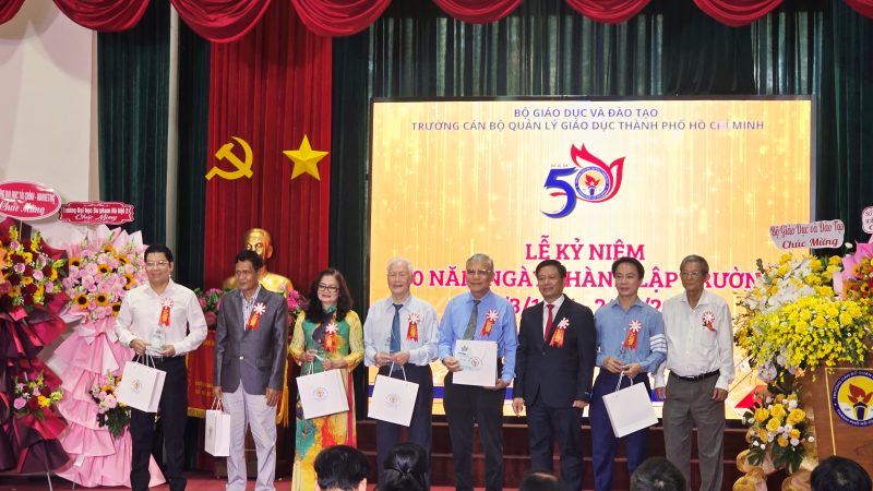 Tại buổi lễ, nhà trường vinh dự nhận Bằng khen của Bộ trưởng Bộ GD&ĐT cho tập thể và hai cá nhân có thành tích xuất sắc trong phát triển đơn vị. Dịp này, nhà trường cũng được trao Cờ truyền thống của UBND TP.HCM, ghi nhận những đóng góp nổi bật trong công tác đào tạo, bồi dưỡng cán bộ quản lý giáo dục suốt 50 năm qua. Bên cạnh đó, các cá nhân của nhà trường cũng được trao Kỷ niệm chương “Vì sự nghiệp phát triển giáo dục” của Bộ GD&ĐT.